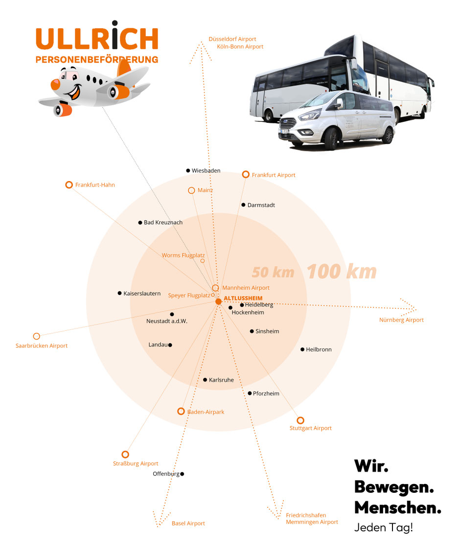 Im regionalen Bereich sind wir insbesondere für Schülerfahrten, Shuttle- und Krankenfahrten im Einsatz – hauptsächlich rund um unseren Standort in Altlußheim.